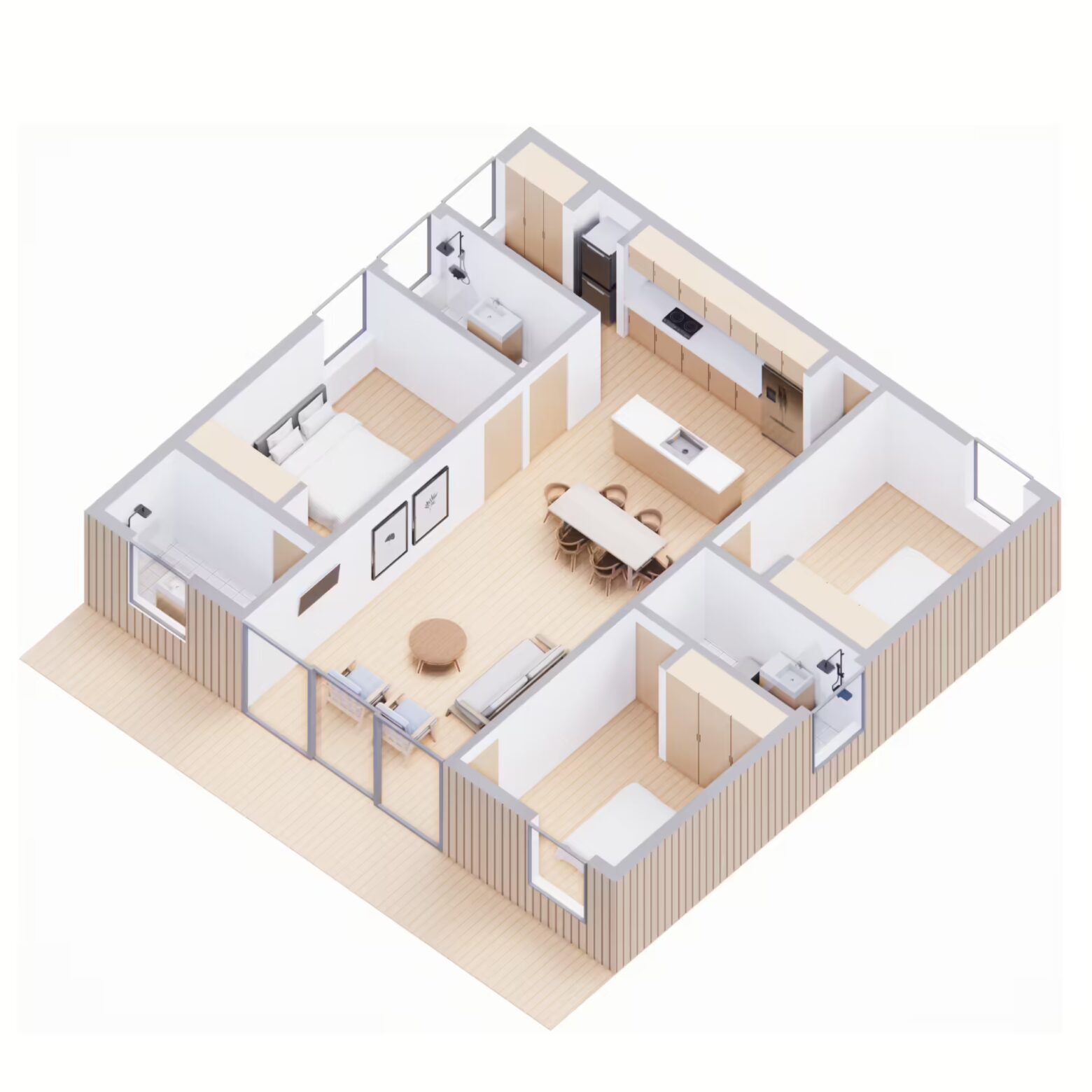 The Shasta is an 1,200 square foot, three bedroom, three bathroom ADU.
