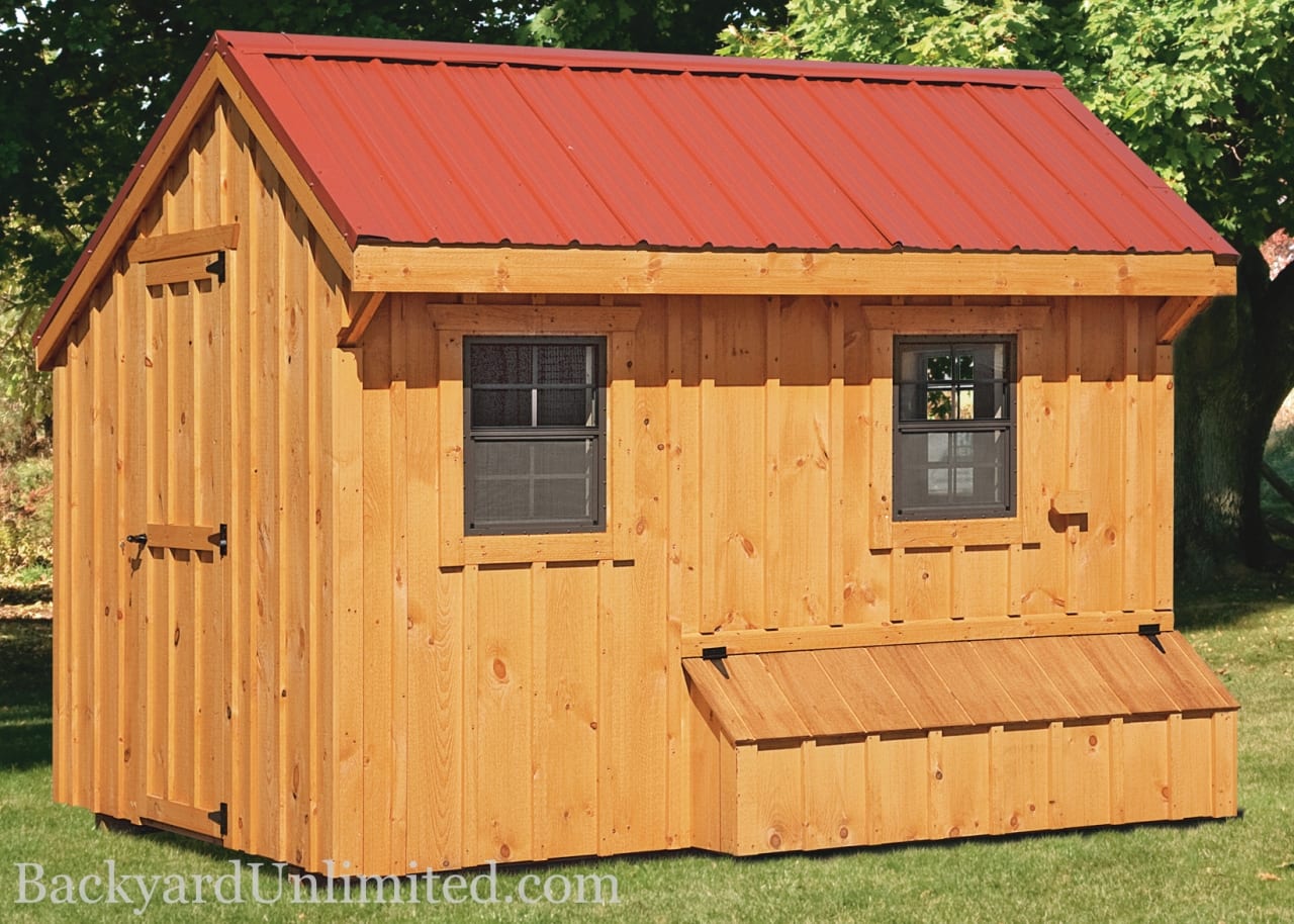5×8 Quaker Chicken Coop with tongue & groove siding, metal roof, and painted door, trim and nest box lid