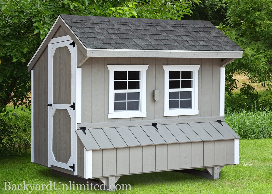 Our Quaker Chicken Coop is a great way to get started in raising a backyard flock. This prefab chicken coop features an attractive roof style that maximizes headroom. Each coop is built to order, so you can select the siding and roofing color. Customize your new coop by adding an attached run, removable litter tray, and wheels.